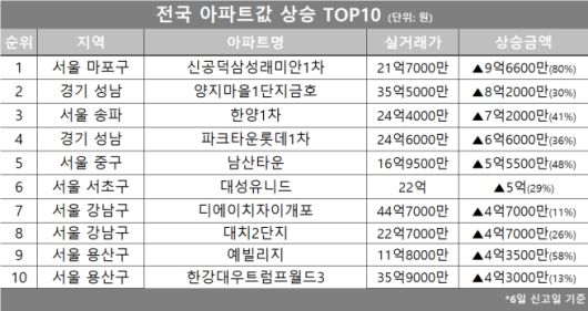 이 밖에도 서울 서초구 ‘대성유니드’, 강남구 ‘디에이치자이개포’, ‘대치2단지’, 용산구 ‘예빌리지’, ‘한강대우트럼프월드3’ 등이 전국 아파트값 상승 상위 10위권에 포함됐다.