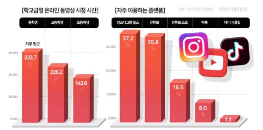 아시아투데이 정아름 기자 = 한국 10대 청소년들이 유튜브와 인스타그램 릴스 등 온라인 동영상 콘텐츠를 하루 평균 3시간 이상 시청하는 것으로 나타났다.