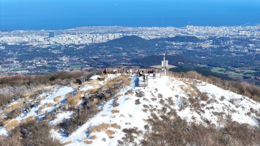 6일 눈이 쌓인 제주시 해안동 어승생악 정상에 사람들이 모여들어 겨울을 즐기고 있다. 연합뉴스. |
