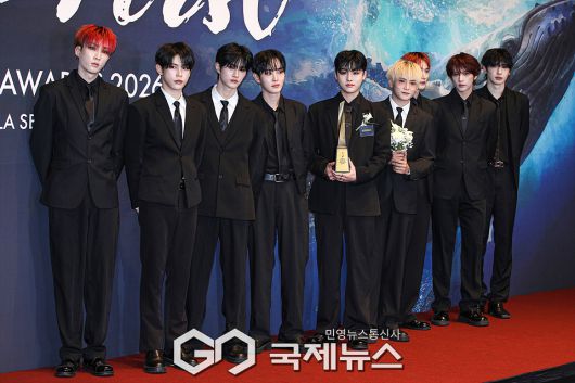 (서울=국제뉴스) 이대웅 기자 = 보이그룹 소디엑(XODIAC) 웨인, 규민, 리오, 현식, 렉스, 자얀, 범수, 씽, 다빈이 6일 오후 서울 중구 신라호텔 다이너스티홀 로비에서 진행된 '2026 대한민국 퍼스트브랜드 대상' 포토월에 참석해 포즈를 취하고 있다.