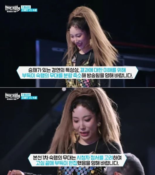 실제 방송에서도 숙행의 본 무대는 제외됐지만, 경연 흐름의 이해를 위해 일부 화면과 설명이 반복적으로 노출됐다. 제작진은 "승패가 있는 경연의 특성상 불가피했다", "시청자 정서를 고려해 고심 끝에 편집했다" 등의 안내 문구를 여러 차례 덧붙였다.