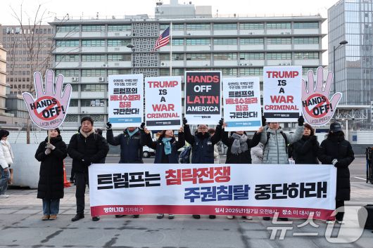 (서울=뉴스1) 김도우 기자 = 평화주권행동 평화너머 활동가들이 7일 서울 종로구 미국대사관인근에서 미국의 베네수엘라 침공을 규탄하며 피켓팅을 하고있다. 2026.1.7/뉴스1