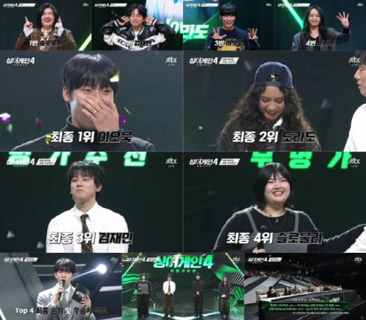지난 6일 방송된 JTBC ‘싱어게인-무명가수전 시즌4’ 최종회에서는 톱 4 슬로울리, 김재민, 도라도, 이오욱이 최종 우승을 향한 마지막 경연을 펼쳤다. ‘다시 한번’ 무대에 서고 싶다는 간절함으로 시작한 대장정은 매 라운드마다 레전드 무대를 쏟아내며 감동과 전율을 선사했다.