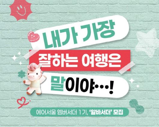 알바서더 모집 기간은 오는 5일부터 11일까지며, 지원 방법과 자세한 내용은 에어서울 홈페이지와 모바일 앱, 인스타그램 채널을 통해 확인할 수 있다.