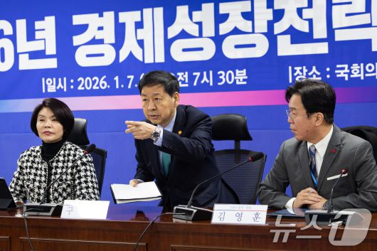 (서울=뉴스1) 유승관 기자 = 구윤철 부총리 겸 재정경제부 장관이 7일 서울 여의도 국회 의원회관에서 열린 2026년 경제성장전략 당정협의에서 공개 발언 후 자리를 이동하고 있다. 왼쪽부터 한정애 민주당 정책위의장, 구 부총리, 김영훈 고용노동부 장관. 2026.1.7/뉴스1