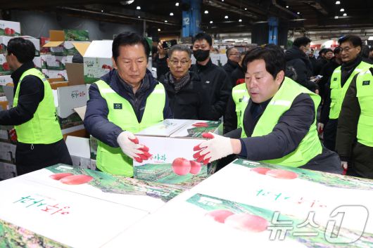 (서울=뉴스1) 신웅수 기자 = 정청래 더불어민주당 대표가 7일 서울 송파구 가락동 농수산물 종합도매시장을 찾아 낙찰받은 과일을 옮기고 있다. 2026.1.7/뉴스1