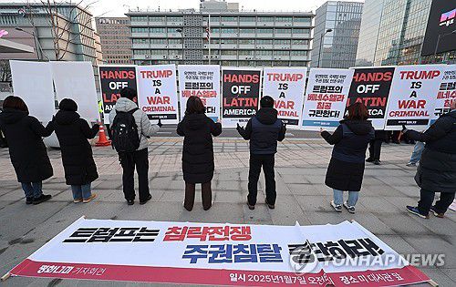 (서울=연합뉴스) 김주형 기자 = 평화주권행동 평화넘어 관계자들이 7일 오전 서울 종로구 주한 미국대사관 앞에서 '미국 베네수엘라 침공규탄 항의행동'을 열고 핸즈오프 피케팅을 하고 있다. 2026.1.7