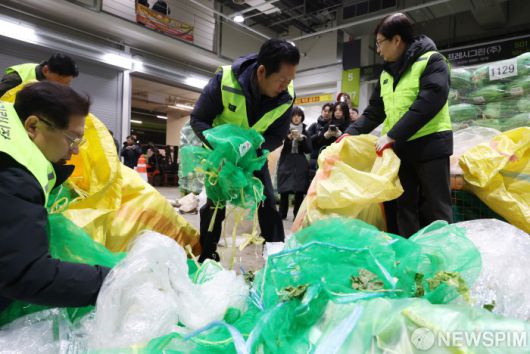[서울=뉴스핌] 정일구 기자 = 정청래 더불어민주당 대표가 7일 오전 서울 송파구 가락동 농수산물도매시장 채소2동을 현장 방문해 생활쓰레기 등 환경미화 봉사를 하고 있다. 2026.01.07 mironj19@newspim.com