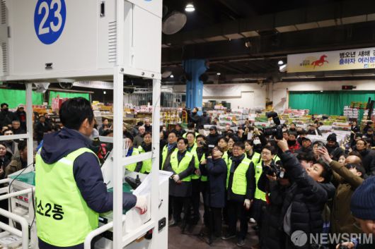 [서울=뉴스핌] 정일구 기자 = 정청래 더불어민주당 대표가 7일 오전 서울 송파구 가락동 농수산물도매시장 경매장을 현장 방문해 인사말 하고 있다. 2026.01.07 mironj19@newspim.com
