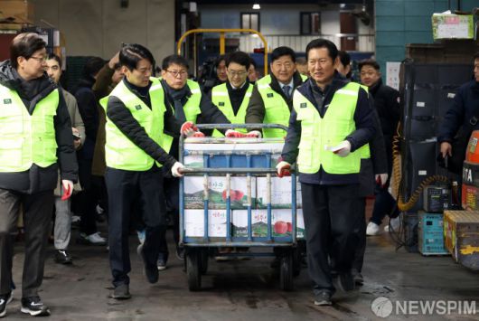 [서울=뉴스핌] 정일구 기자 = 정청래 더불어민주당 대표가 7일 오전 서울 송파구 가락동 농수산물도매시장을 현장 방문해 사과 박스를 옮긴 뒤 이동하고 있다. 2026.01.07 mironj19@newspim.com