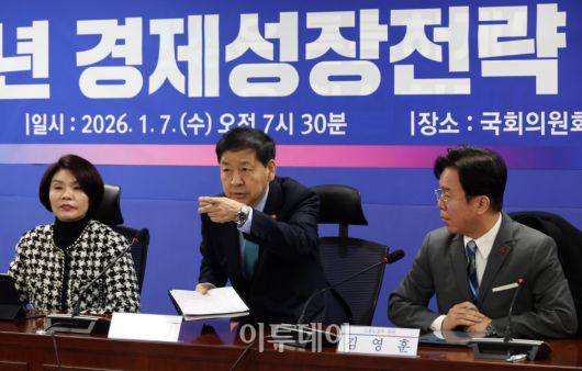 한정애 더불어민주당 정책위의장, 구윤철 경제부총리 겸 재정경제부 장관, 김영훈 고용노동부 장관이 7일 서울 여의도 국회 의원회관에서 열린 2026년 경제성장전략 당정협의에 참석하고 있다. 고이란 기자 photoeran@