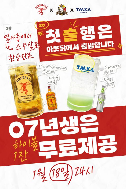 아웃닭 관계자는 "새해를 맞아 처음으로 성인이 된 2007년생들에게 의미 있는 추억을 선물하고자 이번 프로모션을 준비했다"며 "공식 수입사인 비이엑스 스피리츠 코리아와의 협업을 통해 완성도 높은 하이볼 경험을 제공할 수 있을 것으로 기대한다"고 말했다.
