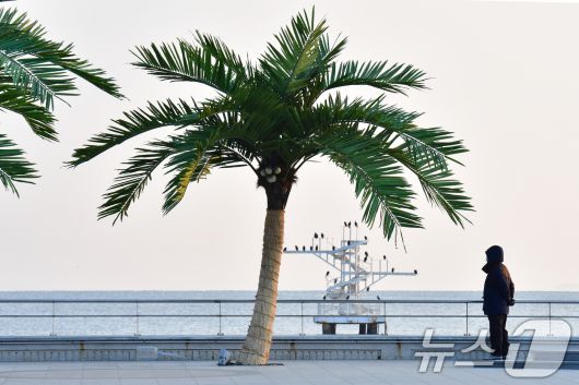 (포항=뉴스1) 최창호 기자 = 7일 경북 포항시 송도해수욕장 평화의 여신상 광장에 조성된 인공 야자수 앞에서 산책 나온 시민이 쉬고 있다. 2026.1.7/뉴스1