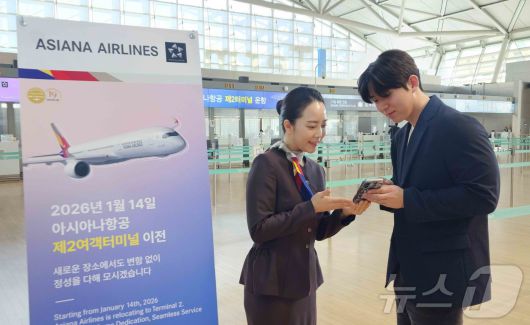 (서울=뉴스1) = 아시아나항공이 이달 14일부터 인천공항 제2여객터미널(T2)에서 운항한다고 7일 밝혔다. 사진은 아시아나항공 직원이 승객에게 터미널 이전 안내를 하고 있는 모습. (아시아나항공 제공. 재판매 및 DB 금지) 2026.1.7/뉴스1urodoct2@news1.krCopyright ⓒ 뉴스1. All rights reserved. 무단 전재 및 재배포, AI학습 이용 금지.