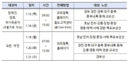19일부터 21일까지 사흘간 오전 7시부터 오후 1시까지는 경로·장애인·국가유공자(교통지원 대상)를 포함한 모든 국민을 대상으로 예매가 진행됩니다.