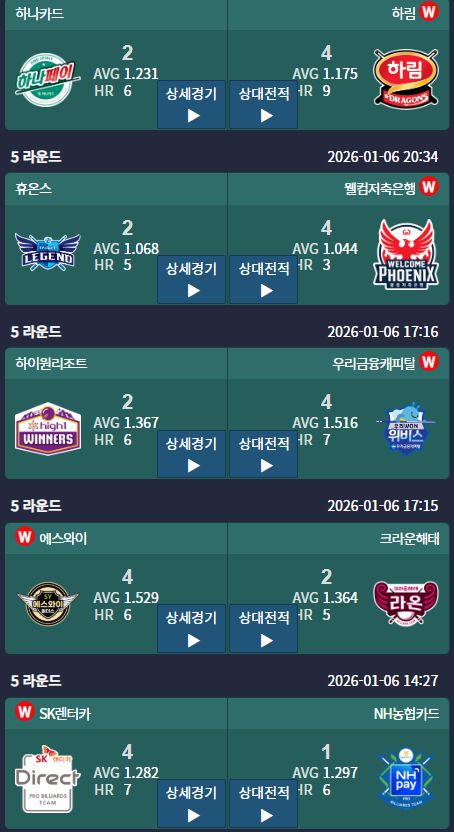 6일 경기도 고양시 '고양 킨텍스 PBA 스타디움'에서 열린 '웰컴저축은행 PBA 팀리그 2025-2026' 5라운드 4일차 경기에서 하림, SK렌터카, 우리금융캐피탈, 에스와이, 웰컴저축은행이 나란히 승리를 거뒀다.