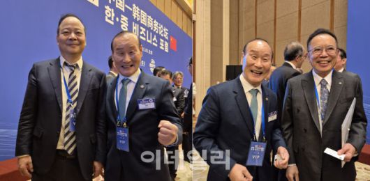 (좌측) 패션그룹형지 최병오 회장(오른쪽)이 방중 경제사절단 일정 중 한?중 비즈니스 포럼 자리에서 청위췬 CATL 회장(왼쪽)과 어깨를 나란히 한 모습 (우측) 한?중 비즈니스 포럼 자리에서 패션그룹형지 최병오 회장(왼쪽)과 TCL과기그룹 리동성 회장(오른쪽)의 모습 (사진=패션그룹형지) |