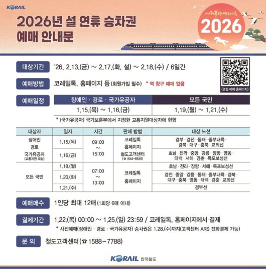 한국철도공사(코레일)가 오는 15일부터 ‘2026년 설 연휴 승차권 예매’를 시행한다.