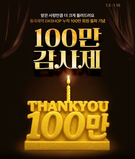 [파이낸셜뉴스] 동국제약이 헬스케어 공식몰 ‘DK SHOP’의 누적 회원 수 100만 명 돌파를 기념해 오는 31일까지 고객 성원에 보답하는 ‘100만 감사제’를 진행한다고 7일 밝혔다.