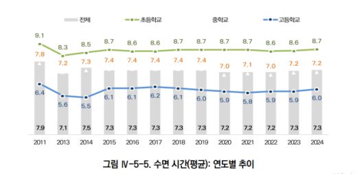 7일 한국청소년정책연구원이 발간한 ‘2024 한국 아동·청소년 인권실태 기초분석보고서’에 따르면 전국 일반고 재학생 2258명을 대상으로 한 설문에서 일일 수면 시간이 6시간 미만이라고 응답한 사람은 전체의 46.7%에 달했다. 이 가운데 ‘5시간 이상 6시간 미만’은 29.7%였고 ‘5시간 미만’도 17.0%나 됐다.