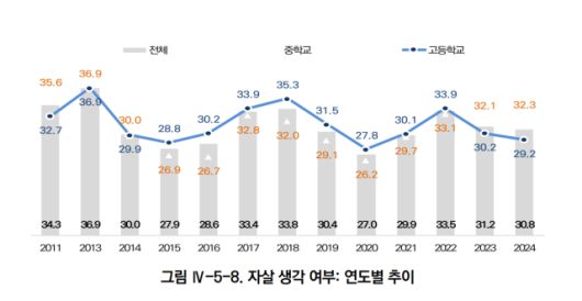 공부 부담은 학생들의 정신건강과 행복에도 여전히 많은 영향을 미치는 것으로 파악됐다. 자살 생각을 한다는 일반고 학생은 전체의 30.5%를 차지했는데, 이들 중 절반 가까이(46.4%)가 그 이유로 성적과 학업 부담을 꼽았다. 진로에 대한 불안을 지목한 사람도 25.2%였다.