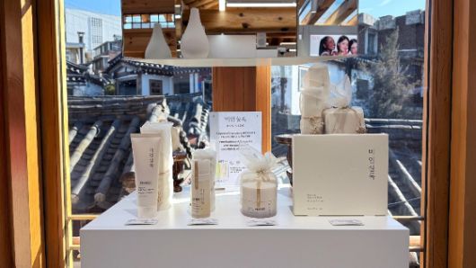 막걸리 술지게미를 활용한 국내 최초의 뷰티 브랜드 '미인실록'의 제품들이 최근 서울 삼청동 북촌에 오픈한 뷰티 큐레이션 매장 '픽넘버쓰리' 1호점에서 전시되고 있다./사진 제공=HLB생활건강 |