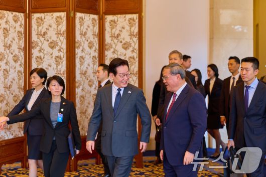 중국을 국빈방문 중인 이재명 대통령이 6일 베이징 조어대에서 리창 총리와 면담을 하기 위해 이동하고 있다. (공동취재) 2026.1.6/뉴스1 ⓒ News1 허경 기자 |