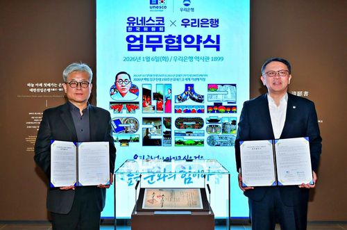 정진완 우리은행장(오른쪽)과 윤병순 유네스코한국위원회 사무총장 직무대행이 지난 6일 서울 중구 우리은행 본점에서 업무협약을 체결한 뒤 기념사진을 촬영하고 있다. [우리은행 제공] |
