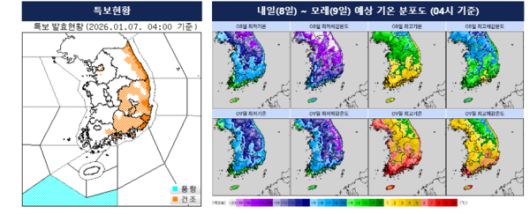 기압골의 영향과 찬 공기의 남하로 오늘 낮 최고기온은 0도~10도 사이에 머물겠고, 내일 아침에는 -14도~-2도, 낮에는 -3도~5도 분포를 보이겠다. 모레 아침(9일)에도 전국 대부분 지역의 아침 최저기온이 -12도~-3도, 낮 최고기온은 2도~9도에 머물러 평년과 비슷하거나 조금 낮은 추위가 계속될 전망이다. 특히 경기북부·동부, 강원내륙 및 산지, 충북, 경북북부내륙은 내일 아침 -10도 이하의 강한 한파가 나타날 것으로 보이며, 중부내륙에서는 내일 낮까지 0도 이하의 기온이 이어져 체감온도는 더욱 낮겠다.