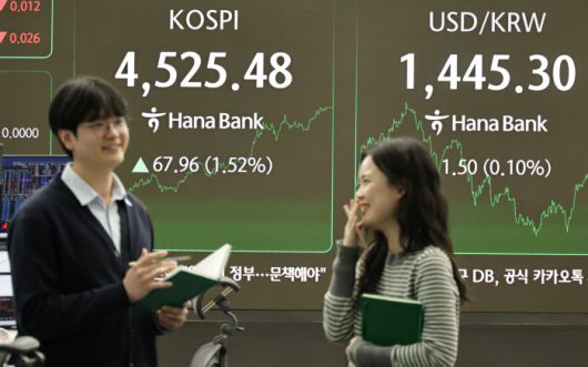 [서울=뉴스핌] 양윤모 기자 = 6일 오후 코스피가 전장 종가보다 67.96 포인트(1.52%) 상승하며 4525.48로, 코스닥은 1.53 포인트(0.16%) 하락한 955.97로 장을 마감한 가운데, 서울 중구 하나은행 딜링룸에서 직원들이 업무를 보고 있다. 서울외환시장에서 달러/원 환율은 전장 대비 1.50원 상승한 1445.30원에 주간거래를 마감했다. 2026.01.06 yym58@newspim.com |