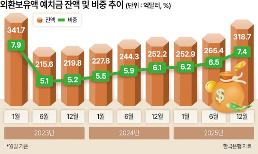 시계열을 보면 예치금 잔액과 비중 모두 지난 2023년 1월 이후 2년 11개월 만에 가장 컸다. 2023년 1월 당시 외환보유액 예치금 잔액은 341억7000만 달러였다. 이후 2024년 3월(305억3000만달러)를 제외하고는 100억~200억달러 선에서 등락했다. 전체 외환보유액에서 예치금이 차지하는 비중도 지난달 말 7.4%로 2023년 1월(7.9%) 이후 가장 높았다.