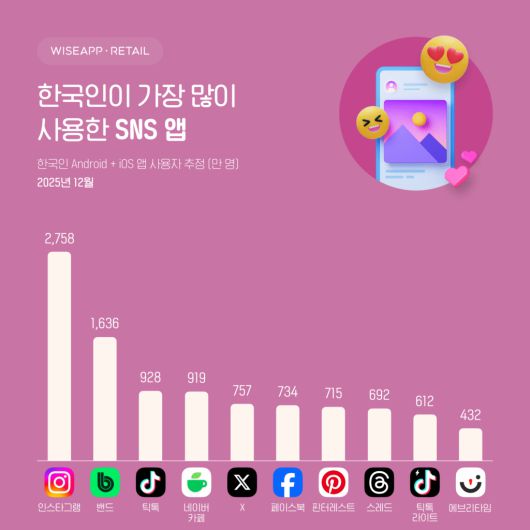 앱 리테일 분석 서비스 와이즈앱 리테일이 2025년 12월 기준 SNS 앱 사용 현황을 조사한 결과에 따르면, 10대 이하 사용자의 월간 활성 사용자 수 1위는 인스타그램으로 412만 명을 기록했다. 2위는 203만 명이 사용한 틱톡이었으며 3위는 핀터레스트로 174만 명으로 집계됐다.