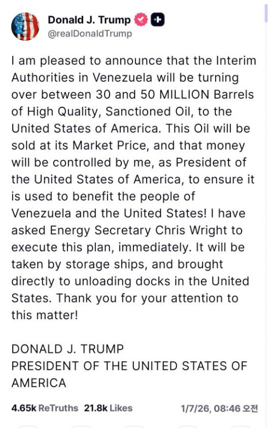 트럼프 대통령은 이날 사회관계망서비스(SNS) 트루스소셜에 "이 원유는 시장 가격으로 판매될 것"이라며 이 같은 메시지를 게시했다.