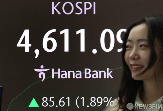 [서울=뉴스핌] 양윤모 기자 = 7일 오전 코스피가 전장 종가보다 85.61 포인트(1.89%) 상승하며 4611.09로, 코스닥은 2.88 포인트(0.30%) 하락한 953.09로 장을 시작한 가운데, 서울 중구 하나은행 딜링룸에서 직원들이 업무를 보고 있다. 서울외환시장에서 달러/원 환율은 전장 대비 0.10원 상승한 1448.90원에 주간거래를 시작했다. 2026.01.07 yym58@newspim.com