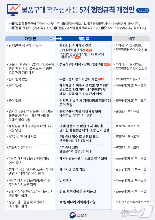 백승보 조달청장은 “이번 규정 개정은 공공조달이 단순히 물건을 사는 수단을 넘어, 안전과 성장이라는 국가적 가치를 실현하는 전략적 수단으로 활용되도록 하기 위한 것”이라며 “기업의 성장을 가로막는 규제는 과감히 깨고, 역동적인 조달 생태계를 만드는 데 최선을 다하겠다”고 말했다.