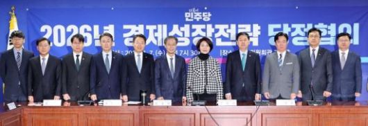 한정애 더불어민주당 정책위의장(왼쪽 일곱 번째)과 구윤철 경제부총리 겸 기획재정부 장관(왼쪽 여덟 번째), 김영훈 고용노동부 장관(왼쪽 아홉 번째)을 비롯한 참석자들이 7일 국회 의원회관에서 열린 2026년 경제성장전략 당정협의에 앞서 기념촬영을 하고 있다. 2026.1.7 김현민 기자 |