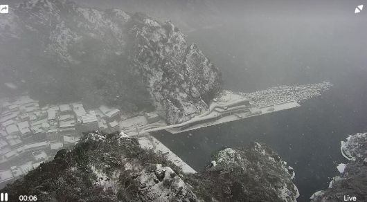 1일 대설경보가 발효된 경북 울릉도와 독도에 시간당 1㎝의 눈이 내리고 있다. 사진은 이날 오후 울릉군 울릉항 실시간 LIVE(라이브)방송 갈무리. /뉴스1 |