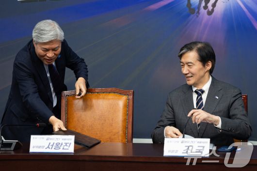 (서울=뉴스1) 유승관 기자 = 조국 조국혁신당 대표가 7일 서울 여의도 국회에서 열린 '끝까지 간다' 특별위원회 회의에서 서왕진 원내대표와 대화하고 있다. 2026.1.7/뉴스1fotogyoo@news1.krCopyright ⓒ 뉴스1. All rights reserved. 무단 전재 및 재배포, AI학습 이용 금지.
