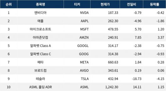 엔비디아(NVDA)는 0.42% 하락한 187.33 달러에 거래를 마감했다. 애플(AAPL)은 1.86% 하락하며 262.30 달러로 마무리됐다. 반면 마이크로소프트(MSFT)는 1.20% 상승한 478.55 달러에 거래를 종료했다.