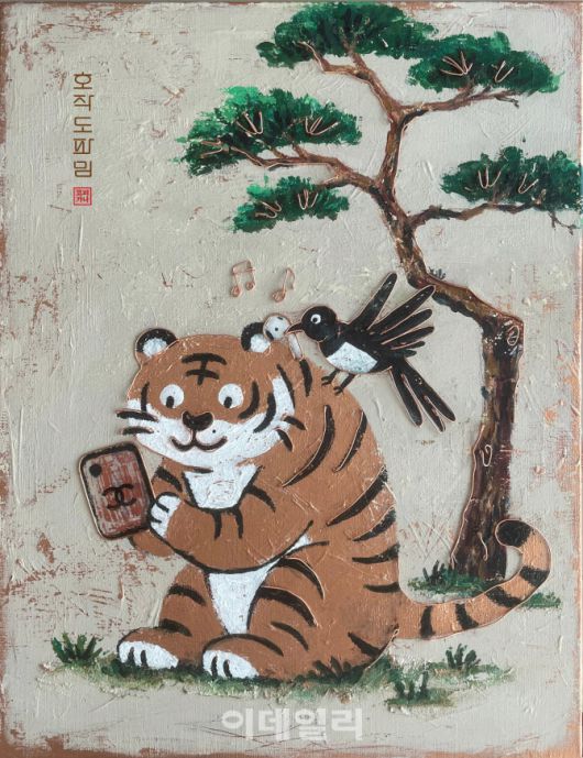 이번 전시에 참여하는 작가 코피가나의 호작도파밈. 스마트폰을 하느라 거북목이 된 호랑이와 몰입을 부추기는 조력자로 변모한 까치의 모습을 담았다.(사진=차갤러리) |