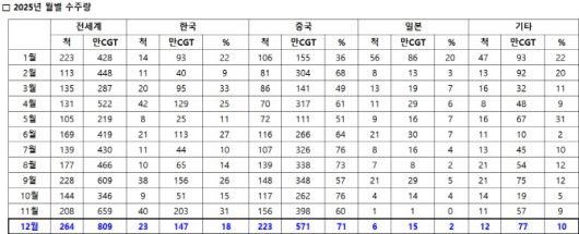 국가별로는 중국이 571만CGT(223척)를 수주해 점유율 71%로 1위를 차지했다. 한국은 147만CGT(23척)로 18%를 차지했고, 중국이 571만CGT(223척, 71%)를 수주했다.