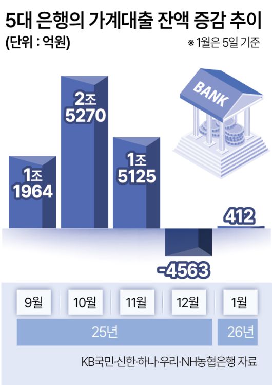 7일 금융권에 따르면 5대 은행(KB국민·신한·하나·우리·NH농협)의 가계대출 잔액은 지난 5일 기준 767조7194억원으로 지난해 12월 말(767조6781억원)보다 412억원 늘어난 것으로 집계됐다. 작년 12월 한 달간 대출잔액이 4563억원 줄며 11개월 만에 감소세로 전환됐던 것과 대비되는 모습이다.