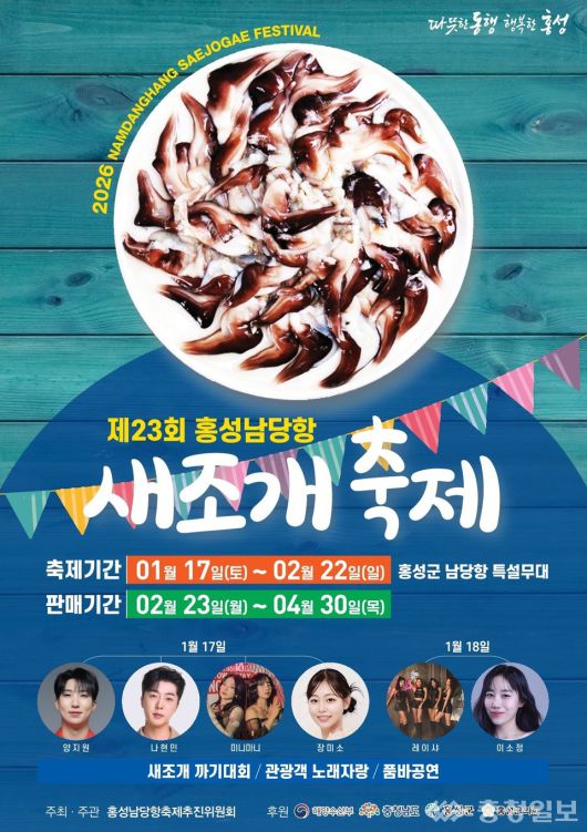 충남 홍성군은 23회 홍성남당항 새조개 축제가 오는 17일 홍성군 서부면 남당항 일원에서 개막해 2월 22일까지 열린다.