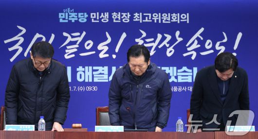 (서울=뉴스1) 신웅수 기자 = 정청래 더불어민주당 대표가 7일 서울 송파구 서울시농수산식품공사에서 열린 서울 민생 현장 최고위원회의에서 인사하고 있다. 2026.1.7/뉴스1phonalist@news1.krCopyright ⓒ 뉴스1. All rights reserved. 무단 전재 및 재배포, AI학습 이용 금지.