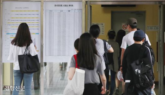 공무원 시험에 응시한 수험생들이 고사장을 확인하고 있다. 경향신문 자료사진 |