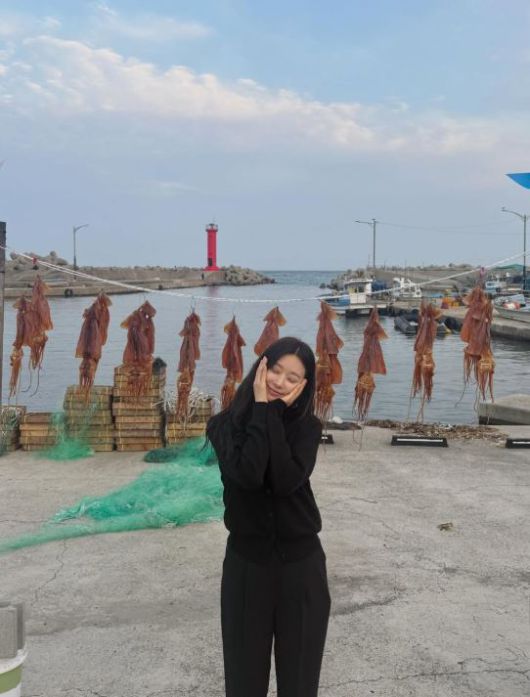 이와 함께 사진도 공개했다. 오징어를 말리는 푸른 바다 앞에서 뛰어난 미모를 과시했다.