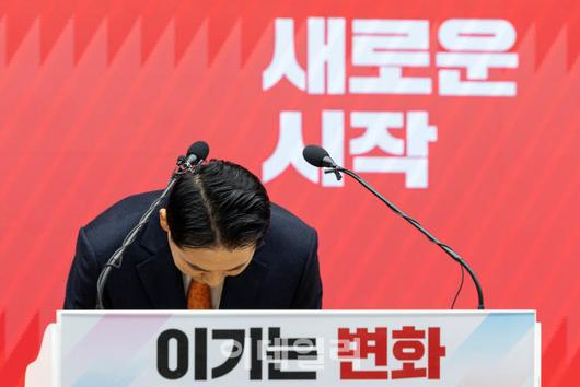 [이데일리 노진환 기자] 장동혁 국민의힘 대표가 7일 서울 여의도 중앙당사에서 열린 긴급기자회견에서 당 쇄신안 등을 발표하며 고개를 숙이고 있다.