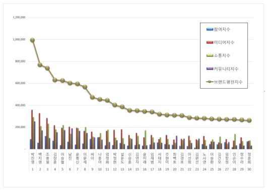 레전드 가수 브랜드평판 1위를 기록한 박진영 브랜드는 참여지수 90,420, 미디어지수 357,892, 소통지수 291,873, 커뮤니티지수 253,508을 기록하며 브랜드평판지수 993,692로 분석됐다. 이는 지난 12월 브랜드평판지수 1,147,935와 비교해 13.44% 하락한 수치다.