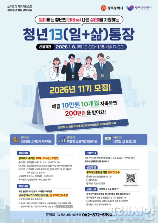 광주광역시(시장 강기정)는 일(1)하는 청년의 더 나은 삶(3)을 지원하는 '청년13(일+삶)통장' 제11기 참여자를 오는 8일부터 18일까지 모집한다.