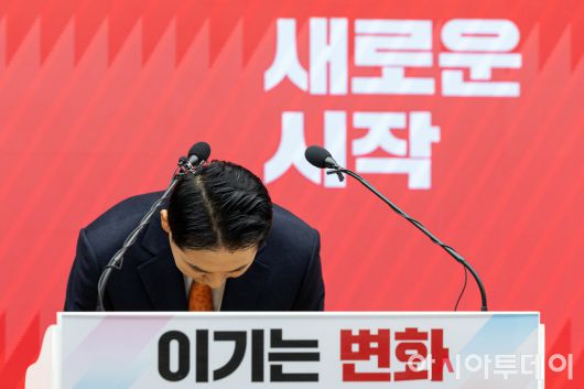 아시아투데이 송의주 기자 = 장동혁 국민의힘 대표가 7일 서울 여의도 중앙당사에서 열린 긴급기자회견에서 고개를 숙이고 있다.
